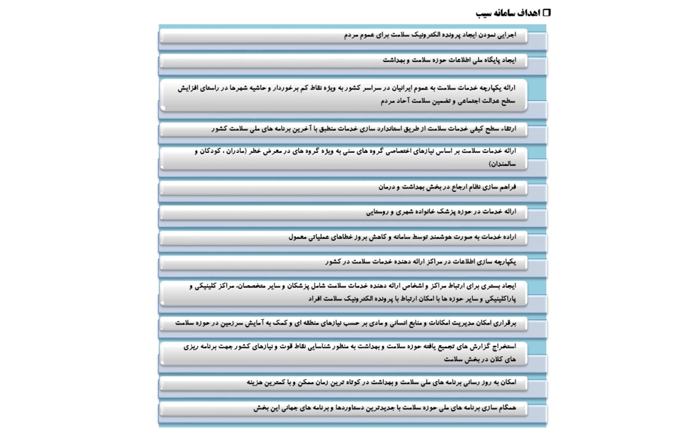 این سامانه که توسط دانشگاه علوم پزشکی اردبیل تولید و مورد بهره برداری قرار گرفته است در ۵ بخش برنامه مادران ، برنامه کودکان ، برنامه باروری سالم ، برنامه میانسالان و برنامه سالمندان به ارائه خدمات میپردازد.