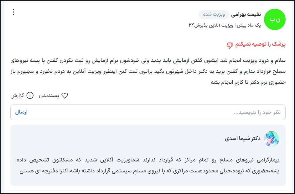 اگر مسئله شما برطرف نشد و پزشک شما را ویزیت نکرد، به پشتیبانی پذیرش24 به آدرس https://support.paziresh24.com/ اطلاع دهید.